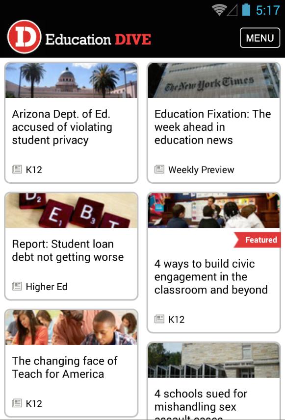 An educational news feed that covers Higher Ed, K12, Tech, Policy, Online Learning, Legal/Courts, and For Profit headlines.